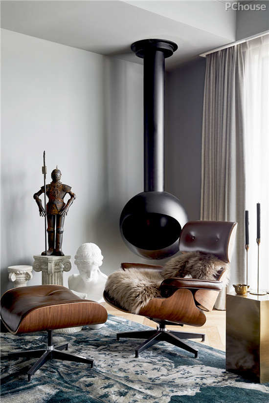 客厅的Thonet、Pantone、Eames、Series 7 和 Grand Prix Chair 与窗外的城市景观遥遥相望,射进来的充沛阳光将其照得通透发亮。