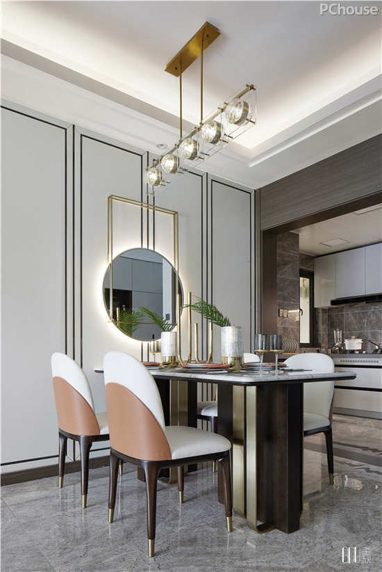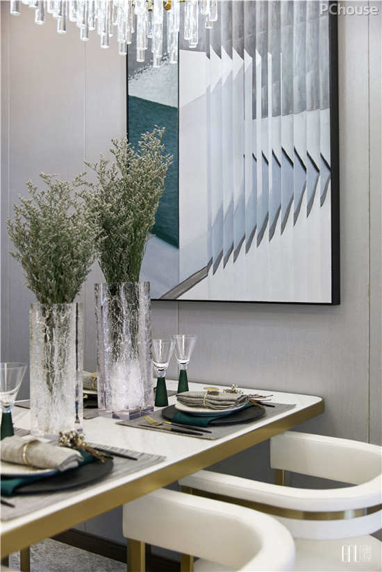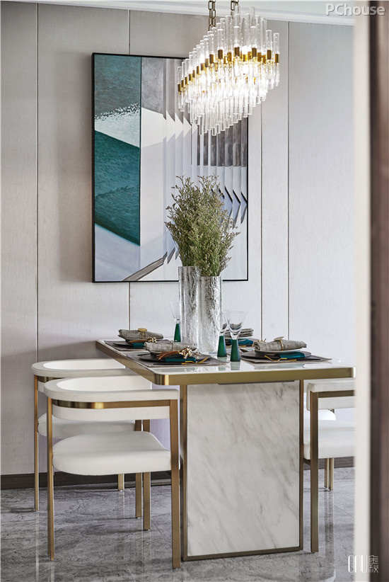 在餐厅这样一个开放的空间里,设计师采用“对称式”陈设手法,和谐地容纳性格迥异的材质——皮革、大理石、金属等。以灯饰、镜框及餐具的相对对称,呈现出平衡、庄重之美。