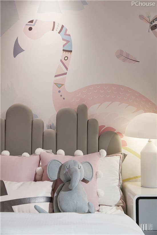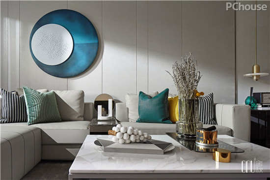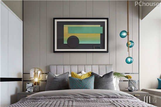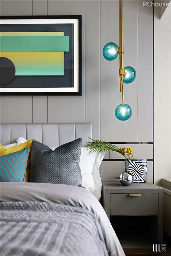 在陈设细节上,多采用呼应式手法,将同色不同质的挂画、软垫、灯饰及饰物相互映衬。相对私密的卧室中,几何表达式的手法利用几何的抽象形,形成了手法简洁、曲直变化、方圆对比、色彩明快、节奏感强的环境特色。