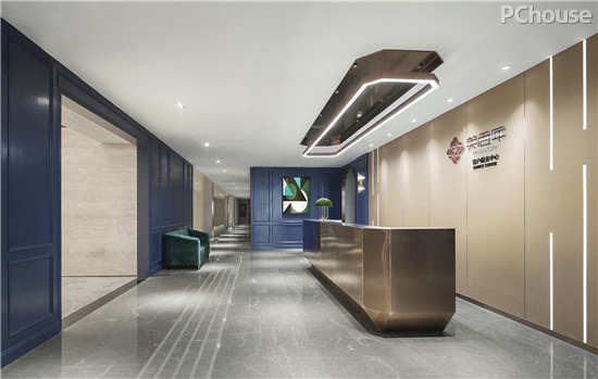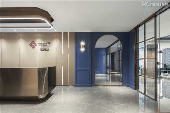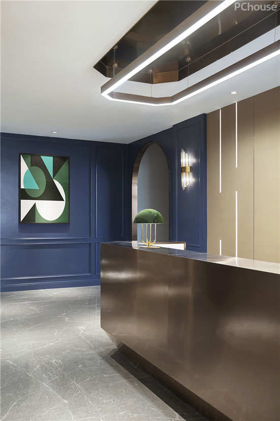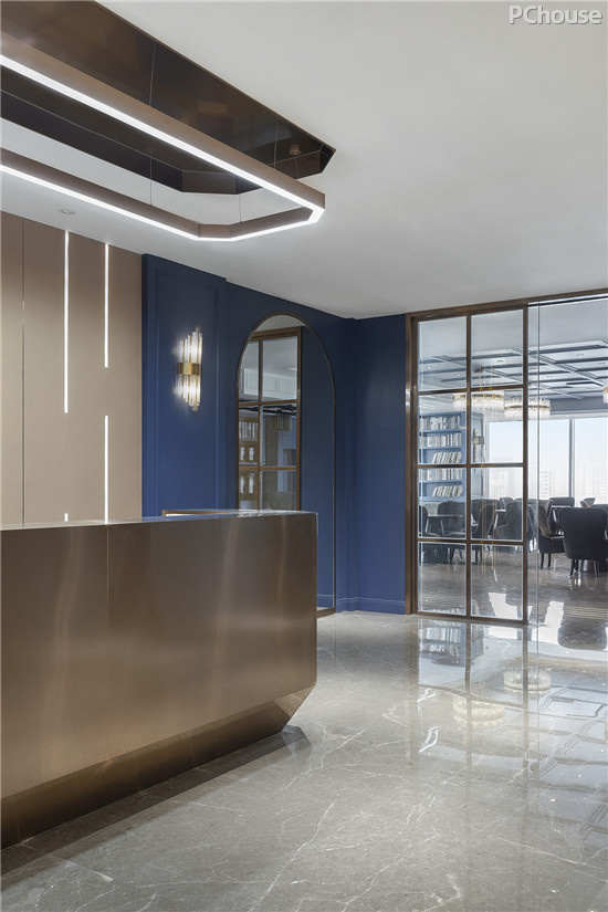 金属线条、台面的搭配,营造了现代精致的属性,两旁巧用水晶灯管提点,让这层深蓝更为高雅丰富。此外,空间分布中,一改封闭式的手法,以玻璃面为隔断,使整体更为透亮。