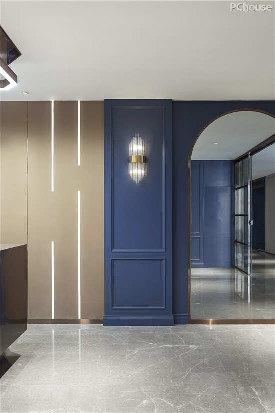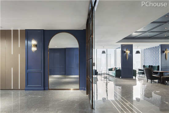 复古而时尚味道从正厅就弥漫开来,拱形的门框植入了西式建筑的典雅,将时光的法条瞬间拉回那个拥有着贵族气韵的恢弘庄园。而深蓝作为本场主角,它与黄铜色泽的拼接注定不落平俗,以独特的色彩语言凝练了种种深层、自由、烂漫、洒脱,撑起一片情愫。