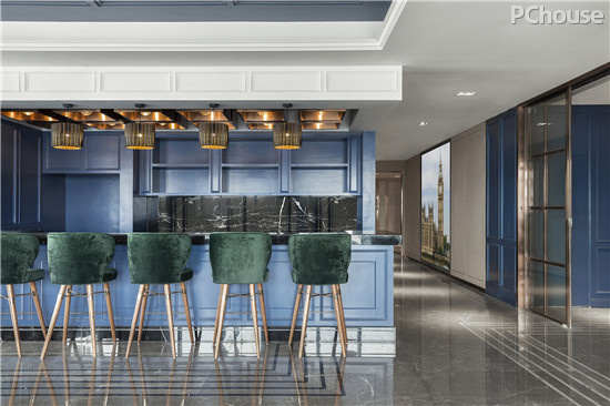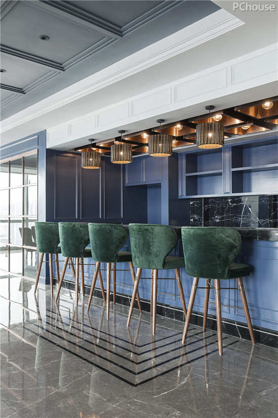 狭长的吧台前卫美观,是本案的设计特色之一。深绿的高椅以相近的色彩属性,共同创造了和谐感。颇有动感纹理的黑白大理石游刃其中,彰显恢弘本质。