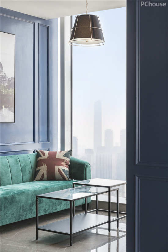 在日光的抚照下,俊朗气派的绿绒面料,给人以温馨舒适,复刻着英式元素的抱枕与挂画让空间积聚着绅士情怀,搭配蓝白线条纹案,如此的英伦之风,是对复古与时尚,惬意与优雅并存的最好诠释。