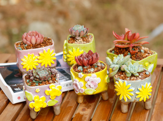 这个花盆上的花朵装饰都是纯手工捏制而成,立体感十足,每一个都不尽相同正是手作的魅力之处。小巧精致,配上多肉,看着便能拥有明媚的好心情。