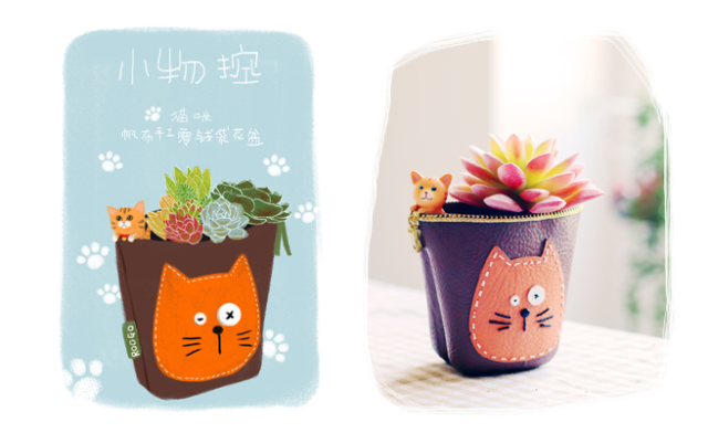 有时候生活的新鲜感就来源于小物件的一次次创新。用陶瓷模仿零钱袋去制作花盆,其中“皮质”的纹路十分逼真,猫咪的表情逗趣,创意十足也趣味十足。