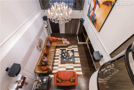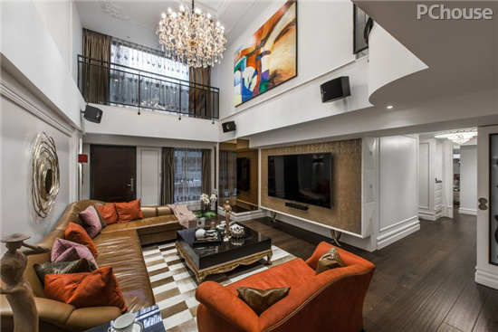 因楼中楼优势带来的高挑视野,使公领域恍如殿堂,纯净的天幕与立面踩踏温润的木质大地,搭配暖棕皮革沙发及木作电视墙,围塑一场花园梦境。其间点缀金红双色,诸如香槟金穹顶、粉金吊灯与橘红软件,再搭佐悬挂于电视墙上方,由Yocico亲手绘製的巨幅壁画,採撷量体中的丰富色系浓缩入画,宛如精炼后的香水散发芬芳气息。回顾周身环境,为化解樑柱的压迫感,沙发背墙透过灵活的线板拼接,使突出的横樑化为立面层次的一部分;另一方面,电视主墙隅角的柱体则覆以金茶镜,虚化体块并达到延展空间的视觉效果。