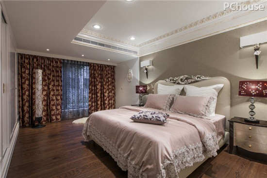 考量一家五口的迥异性格,Yocico发挥「感觉统合」的美感功力,深入每位成员心理,掌握各自的心情、喜好及作息,调配出不同楼层的主题色系。首先是位于一楼的加大主卧室,廊道全权使用白底缀饰金漆及醇红软件,并延展为卧室天幕与立面色彩;地坪则选用能安定心神的棕黑木质拼接,延连至倚窗垂坠的暗红花藤窗帘,将漫溢量体的稳重气质延揽入室。在此基底之上,承托的是绿意搭衬的粉色床品,鲜明却互补的配色正好反映这对夫妇的相处状态;而床头板繁丽且典雅的样式,亦引领双眼循光指引,凝望上方散发华贵气息的棚顶设计,益加衬托这双伴侣间的细腻优雅之情。