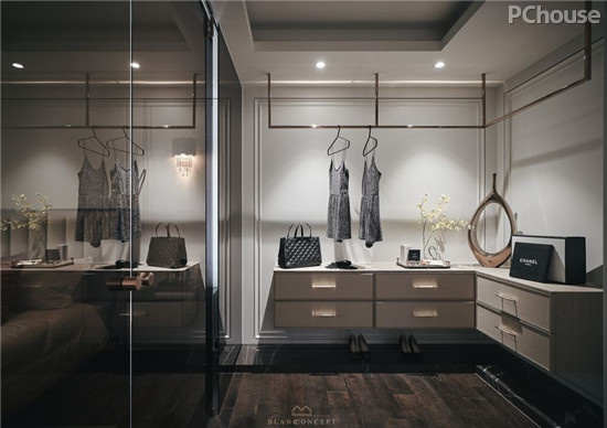 换衣间设置落地黑玻门片,打造通透的空间场景,亦使人在选配服装时能够随时察得户外的阴晴变化。