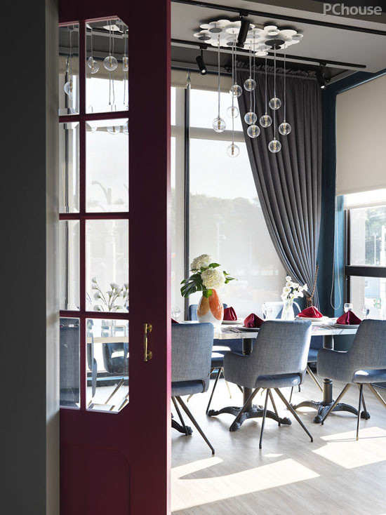 相较于一楼的浓厚色彩,二楼以多扇窗户引光入室,并搭配轻盈用色,特意以图纹玻璃带进一点小中式,打造出通透开阔的视觉,是个都会时尚的用餐空间。