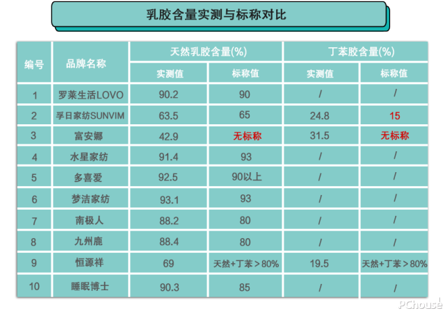 前面也说了,国家并没有规定乳胶枕中天然乳胶的含量要求,所以基本也很少出现虚标的情况,10款产品中,除了2号样品丁苯橡胶标称有出入,3号样品没有标明乳胶含量,9号样品标称模棱两可外,其他产品也都算如实标明了乳胶含量。