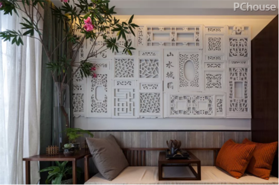 雕花的背景墙和隔断,高耸的花枝和根雕,使客厅颇有禅意;新中式沙发茶几、生机勃勃的绿植,为客厅增添了几许生机,仿佛把园林美景搬回了家。