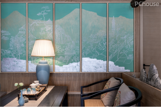伴随着仙鹤的啼鸣,向往着青山绿水的悠然,素色的背景下,错落的房顶中,让在【鹤鸣】房里人也仿佛置身尚湖景区,品茶会友,自在人生。