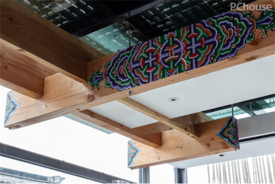 看,老房梁上融入了色彩斑斓的彩衣堂包袱锦彩绘,将传统手工艺引入到现代空间设计当中是设计师由伟壮一直坚持的愿望。