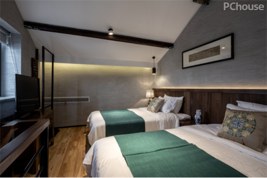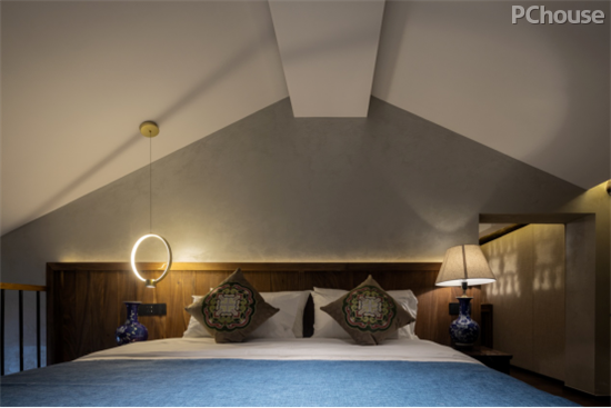 设计师由伟壮在旅游行走中获取了丰富灵感,沙家浜的芦苇草垫的巧妙植入,同时灵光乍现将阁楼里刷上粉墨,就有了简单自然,温馨舒适,适合亲自居住的客房【暮溪】。