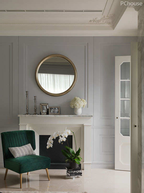 壁炉设置于一旁壁面,不作为中心亮点,却有着聚拢心绪效果。细节则在美式的基底上,加些法式的繁复及浪漫,如天花板的雕花线条比例,恰好的法式华丽,再以特意切成斜角的玻璃格子门,平衡华丽度而带出法式独特的优雅品味。