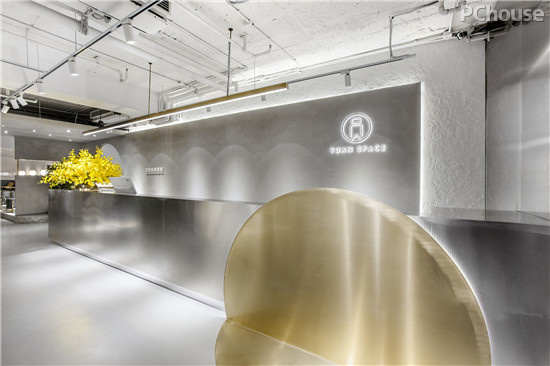 入口区以混凝土背景墙、水泥地面和金属质接待台铺垫工业风的基调。接待台的圆形装置和空间内分布的各种圆形元素呼应了品牌主题。因建筑层高仅2.7m,前厅天花未做吊顶,用裸露的水泥与管线作为朴实的顶部背景。