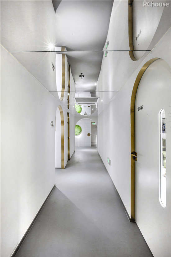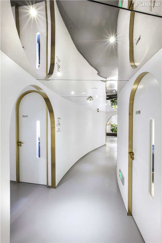 黄铜镶边的几何线条成为空间的主视觉,由嵌入式的产品展示柜放大至半弧形的门洞,叠加分布于弧线型的廊道动线上,镜面反射效果消匿了低矮天花的压抑感并延伸空间视觉。