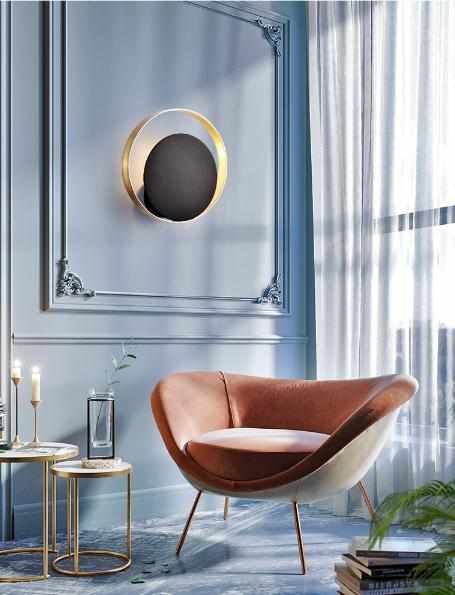 例如这款简约现代风壁灯,几乎是全面积使用金色,并通过它和质感的相互对比和烘托,调制出独一无二的雅痞调性。