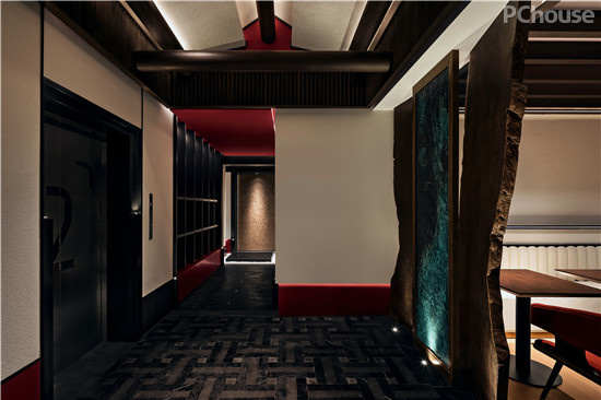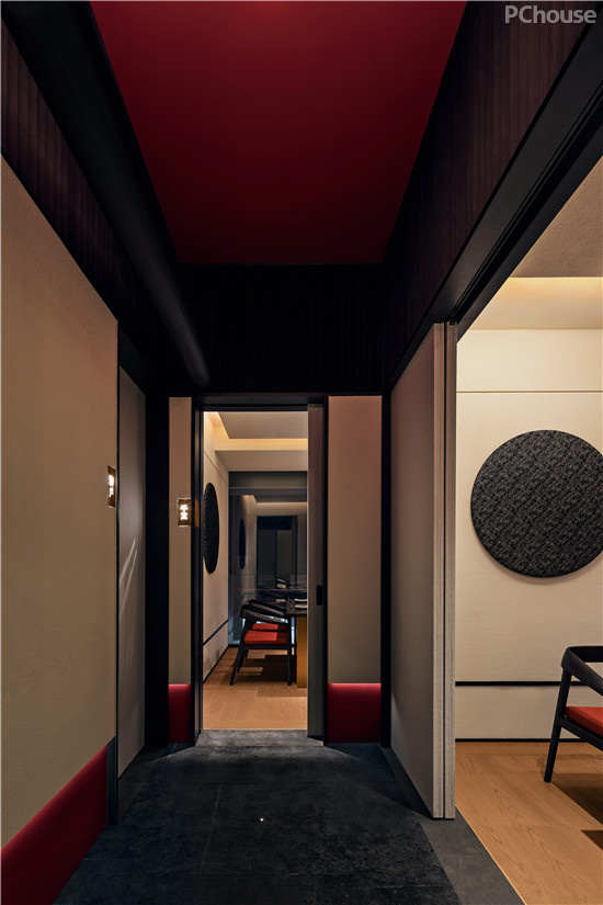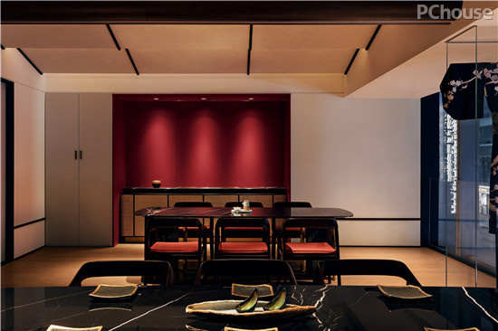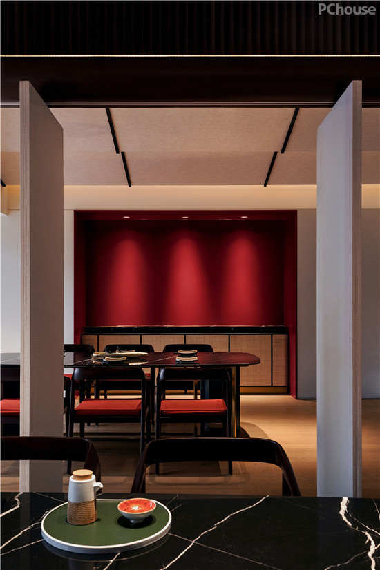 “我个人最喜欢日本红,起初考虑以点缀方式融入空间,但大面积红色的大胆使用,克制铺陈,使其成为空间的重要线索,反而契合了尊重文化本身的思路。”得德设计主理人沙龙特别感慨,也庆幸理念能得到业主的认可,最终呈现也获得了意想不到的妙趣。无论是天花屋梁造型两侧的墙面点缀,墙面脚踏线的反复咏叹,还是重彩的背景色,家私中的那抹红,都恰如其分地游走于留白与简素中,浓淡相宜,相映成趣。