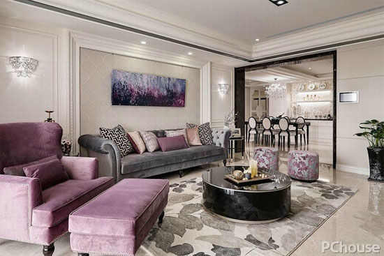 一般在与电视墙相对的墙上,即背靠沙发的墙上,会装点1至3幅装饰画。由于沙发通常是客厅内的主角,在选择客厅装饰画时常常以沙发为中心。中性色和浅色沙发适合搭配暖色调的装饰画,红色等颜色比较鲜亮的沙发适合配以中性基调或相同相近色系的装饰画。色彩基调一致、画面内容接近、装裱样式规格相同的系列画是客厅内的首选。这样整个客厅既显得富于变化又不至于杂乱无章。