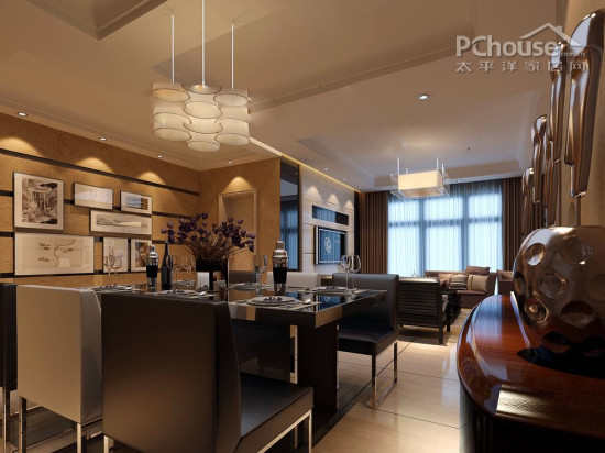 编辑点评:餐桌上的插花可以调节户主的心情而与花瓶相对的吊灯就是整个空间最好的点缀。而远处客厅的吊灯则采用了最规矩的矩形,方正之间凸显的是房间主人严谨的生活态度。
