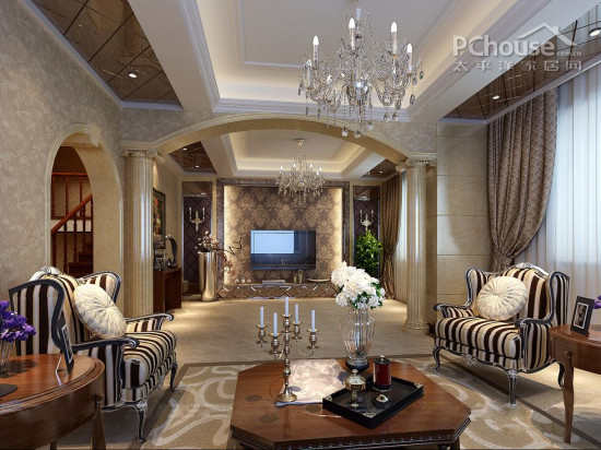 编辑点评:这件会客厅给人最大的感觉就是“富丽堂皇”。不论是桌上的烛台、吊顶的烛台灯,亦或是欧式的大气的弧线形门洞,无不彰显着华贵的设计风格。