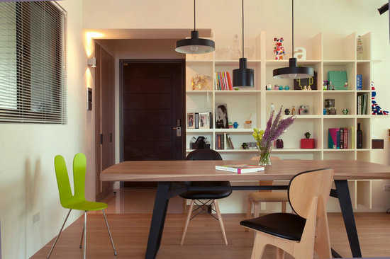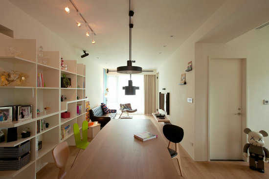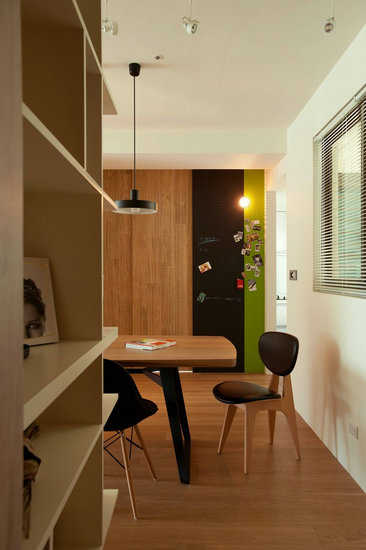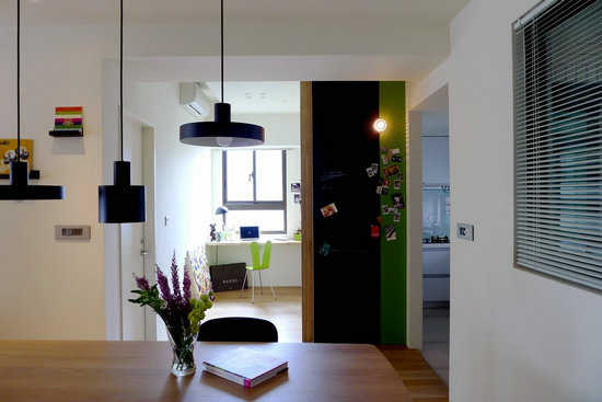在空间机能的分配上,考量未来书房可作为客房运用,特地设以拉门安排,连续性立面中施以漆色活泼与黑板的生活趣味。为遮掩后阳台的视线凌乱,窗面以铝百叶为屏保留视线弹性。