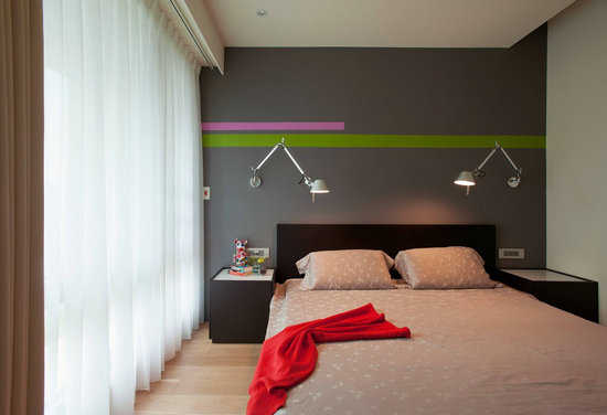 呼应着公领域的色调,主卧房内仍可见紫色系的应用。