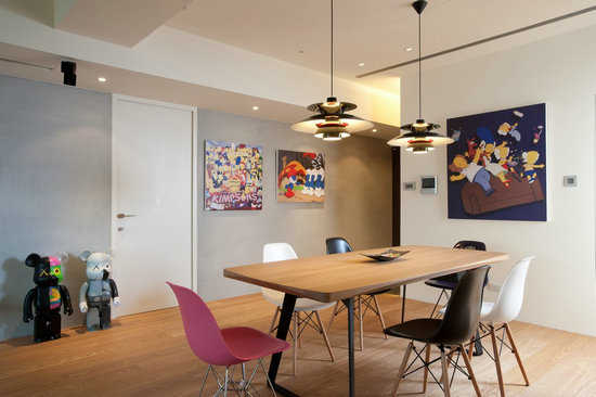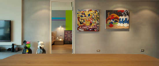 居家空间色度是饱合且充满对比性地,空间中不时可见其对当代涂鸦大师KAWS画作与公仔的狂热喜爱。