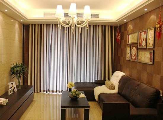 客厅餐厅的设计以咖啡色为主,客厅和餐厅均使用开放式的设计,两个区域采用同一款吊顶和同一个吊灯,灯光是黄色的暖光,营造出一种慵懒的氛围。