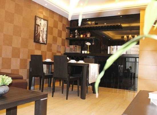 沙发背景墙和餐厅背景墙均采用了照片加以修饰,使结构更加丰富。深咖啡色沙发和黑色餐桌配上咖啡色格子墙纸,犹如在咖啡厅的感觉,休闲惬意又不失氛围。