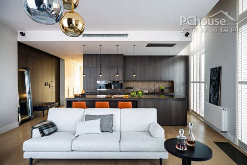 推荐理由:从这个角度可以看见公寓内设颜色的过渡与使用,客厅白色无暇,白色的沙发可谓是亮点,顶上金银两色的吊灯则增添一份奢华。而厨房处则黑色低调,以实用为主。