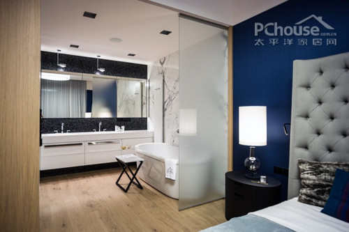 编辑点评:卧室与浴室连接在一起,使得洗澡沐浴更为方便。而浴室则是呈现了另外一种风格,白与黑的经典搭配是浴室的重点。而其中的磨砂玻璃门则负责分隔了两个空间。