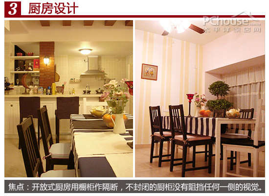 温情地中海主题show:白色的墙体映射着暖和的灯光,用餐区的几条原木色横梁与桌布的蓝白间条相映成趣,白色的吧台与黑色的高脚椅形成对比,整个厨房就是地中海与现代时尚的完美融合。