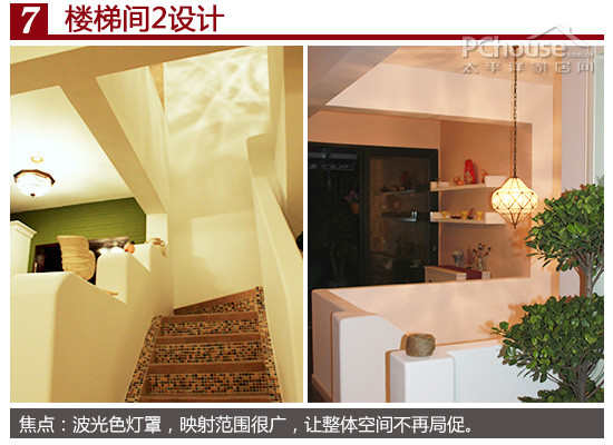 温情地中海主题show:分层式阶梯墙体上,摆放着各种贝壳类装饰,颇有海的情怀。细心的女主人也不忘在墙体的另一侧也贴上小贝壳,特意抠出的小门洞放上装饰品让墙体不那么单调。上楼的阶梯使用了黄蓝色马赛克砖,丰富了楼梯间的色彩。