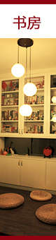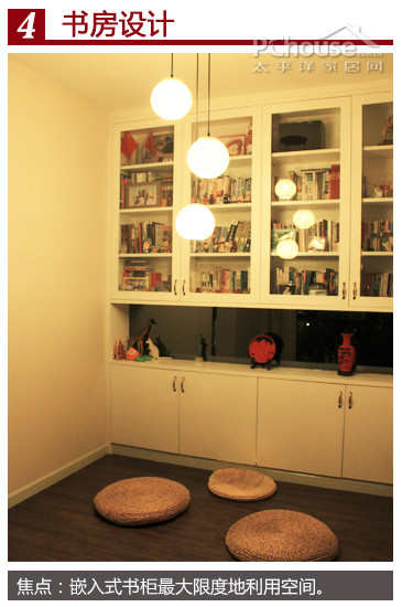 嵌入式书柜设计与墙体相连,让空间得到最大限度的利用,上层玻璃式书柜,下层实门储物柜,中间隔空层放置一些小饰品,让阅读空间更富有情趣。