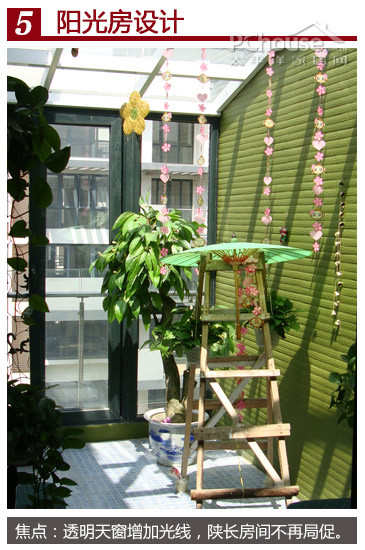 阳光房间的设立有效地利用了顶层这一优势,透明的天窗让充沛的阳光照射进来,即使陕长的房间也因为这透明的天窗与落地玻璃,显示宽敞光亮而不会局促昏暗,从屋内向外走,有一种柳暗花明的感觉。