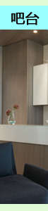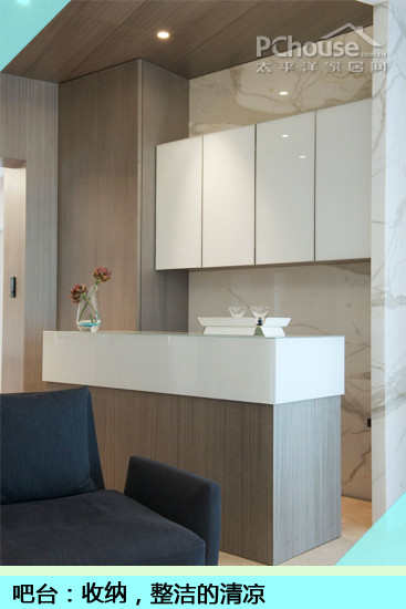 ▼吧台:吧台设计简洁大方,且无任何杂乱的酒瓶杯子出现,桌面隐隐透出一片薄荷绿,似乎暗示这是个倡导“小酒怡情”的健康吧台。