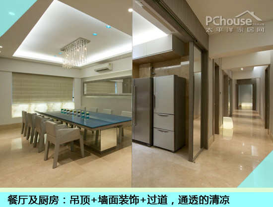 3、通往厨房的过道在吊顶上层层隔开,制造通透感,延长视线。