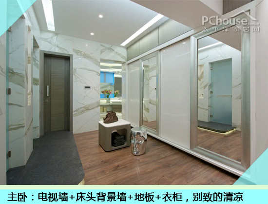3、衣柜设计了一个多功能推拉门,使其和浴室连接起来,扩大卧室空间。