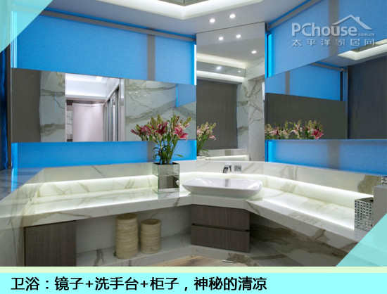 ▼卫浴间:卫浴间是个不规则的平面,设计师利用这个特质设计了一个三角区,镜子墙面的背后全是收纳柜,大大节省了空间。