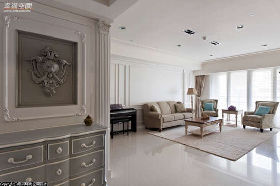 编辑点评:设计师周建志利用两段罗马柱定位出屏风,线板预留与中心镂空设计嵌入男主人所挑选的造型饰板成就量身订作端景。