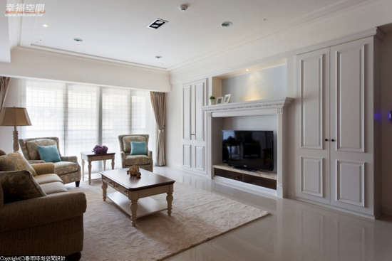 编辑点评:春雨设计以线板妆点,呼应着电视主墙面的对称性,完成耐看且舒适的主体造型。