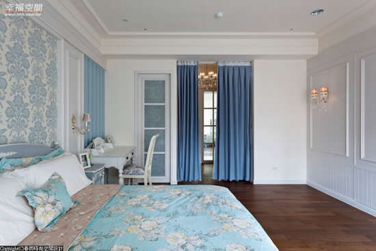 编辑点评:走以淡灰蓝色系的主卧房,床头段落以英式风格壁纸搭配,藉由线板中和表现段落个性画面。