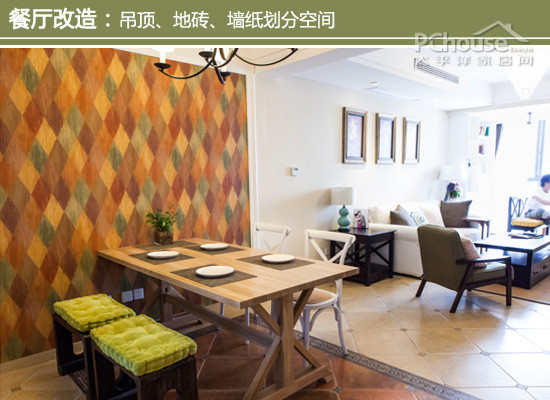 设计师建议:在吊顶、地板和墙纸上做功夫。客厅与餐厅的吊顶是通过横梁分开的,灯饰也完全不一样;从地板来看,用餐区的地砖颜色较周边的深,自然地形成视觉分区;多彩的墙纸设计与客厅的奶白色背景墙形成强烈的对比,不用明说就是两个不同功能的居室。客厅与餐厅之间还留有过道,开放式的设计完全不显局促压迫。