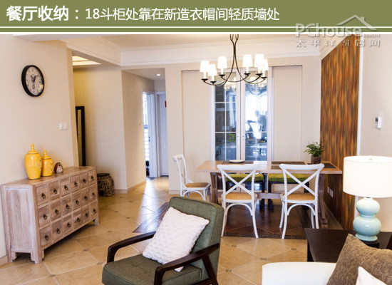 设计师建议:由于在玄关处打造了一个步入式衣帽间,下卧室相连处多了一幢轻质墙,而且正对着餐厅,巧妙地加一个18斗餐边柜。