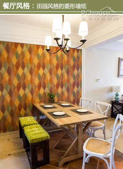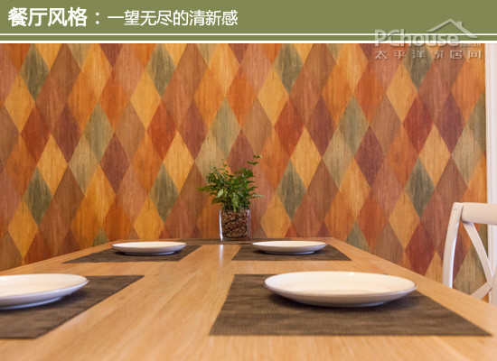 设计师建议:菱形墙纸作为与客厅的分区,格外明显,原木色的桌子靠着墙纸,与桌面的摆放一起看,很有田园的清新感。