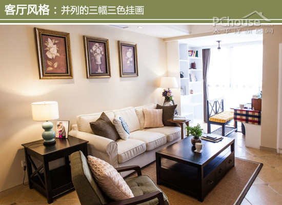 设计师建议:客厅沙发上方并列着三幅古铜色挂画,设计师认为挂画高度过高,但考虑到调整时墙面有洞眼,补色有可能存在色差,就放弃调整了。