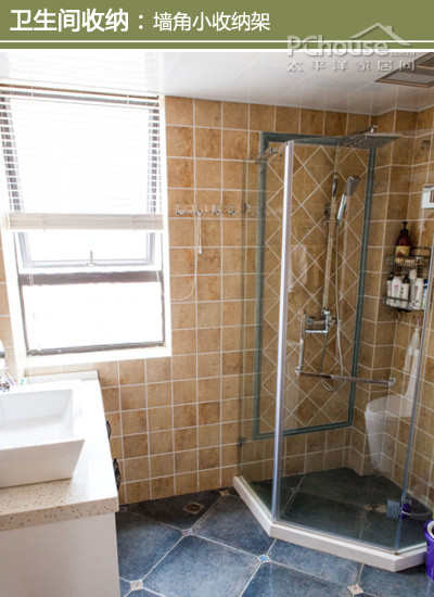 设计师建议:卫生间采用干湿分区设计,面积不大,设计师巧妙地利用角落,打造一个玻璃门分隔的沐浴区,视觉上并没有使空间变小。至于洗浴用品就搁在墙角的收纳架上,方便使用。