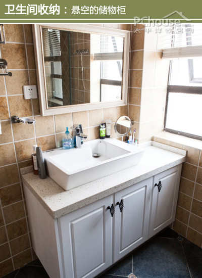 设计师建议:洗手台的周边可以放置日用小品,方便女主人梳妆。台盆洁白素净,让人感觉十分舒适;洗手台下方的柜子则有一点悬空感,悬空处可以塞进拖鞋等小物品。
